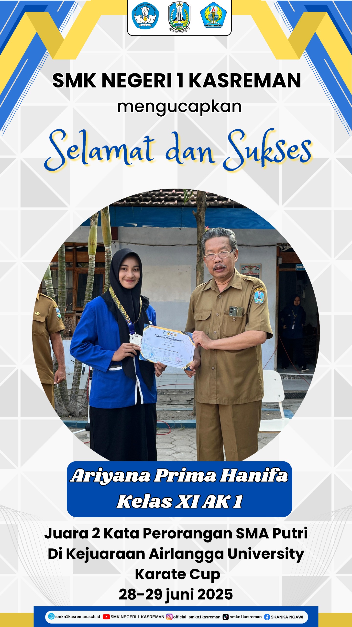 Selamat kepada Ariyana Prima hanifa kelas XI Akuntansi 1, yang telah meraih jura 2 kata perorangan tingkat SMA Putri di Kejuaraan Airlangga University Karate Cup yang dilaksanakan pada tanggal 28-29 Juni 2025.
