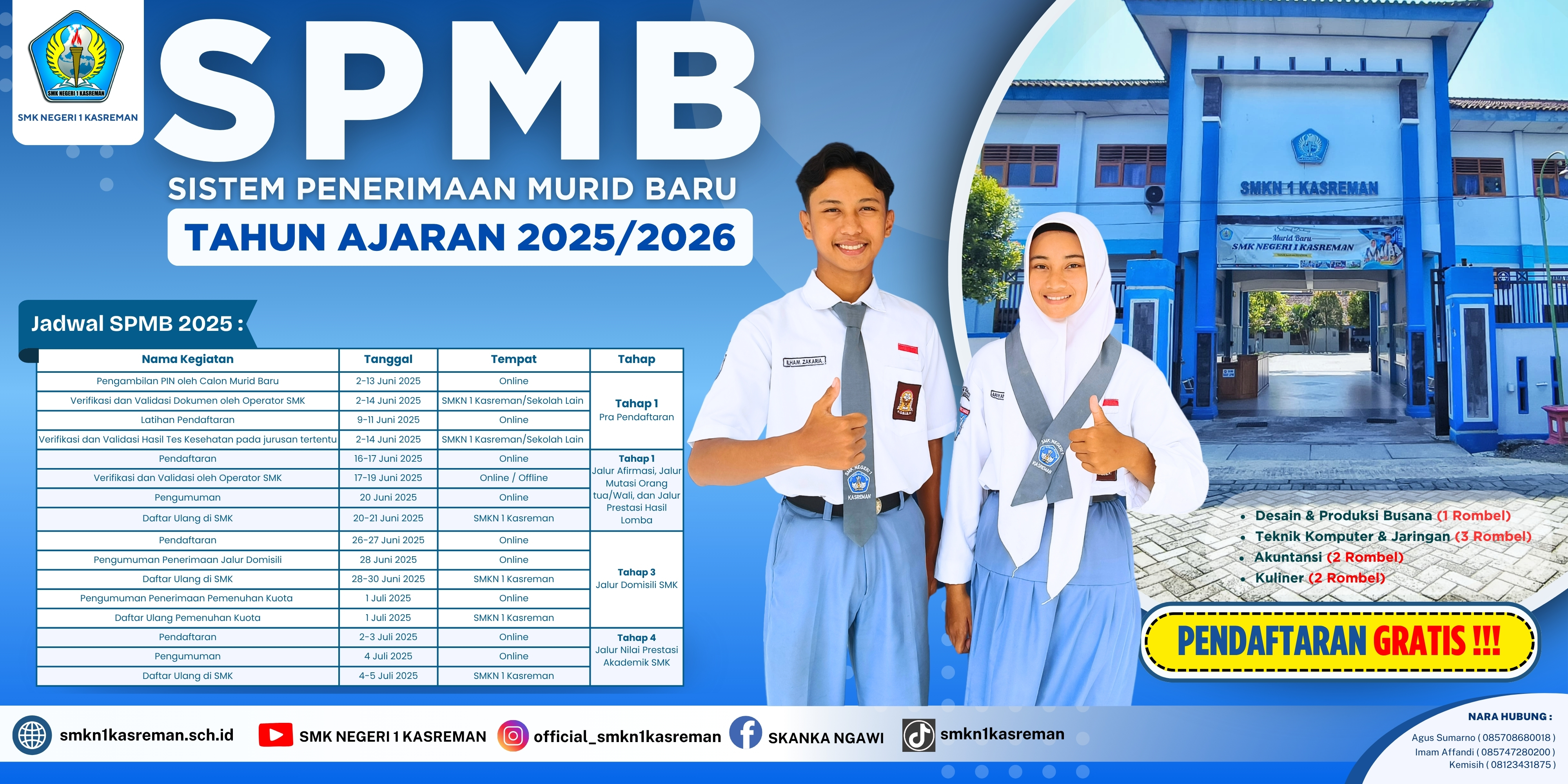 Kami ucapkan selamat atas di terimanya menjadi siswa SMKN 1 Kasreman d Tahap 1 ini,.. 🤝