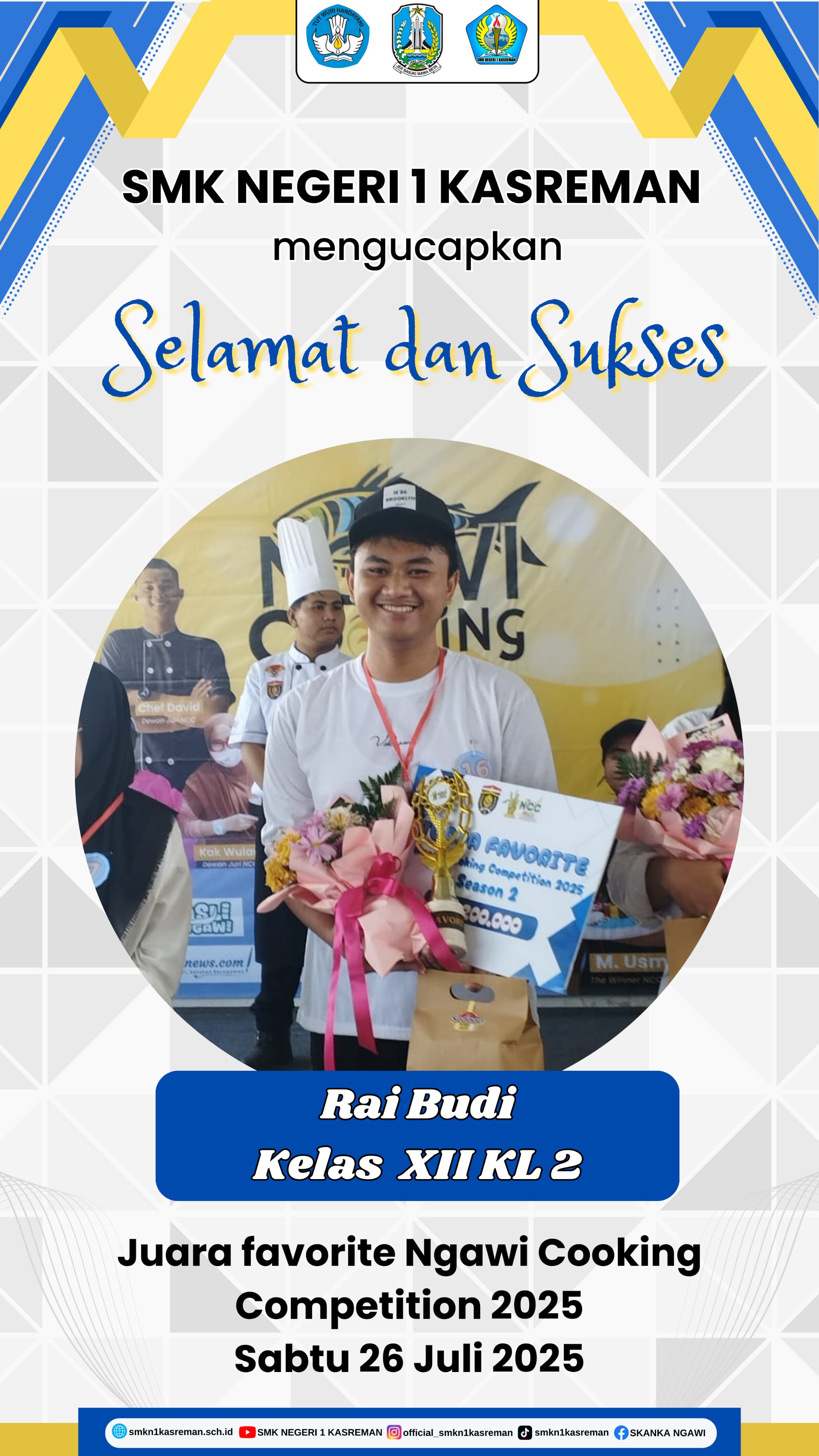 Selamat kepada Rai Budi kelas XII Kuliner 2, yang telah meraih juara Favorit Ngawi Cooking Competition yang dilaksanakan pada hari sabtu tanggal 26 Juli 2025.
