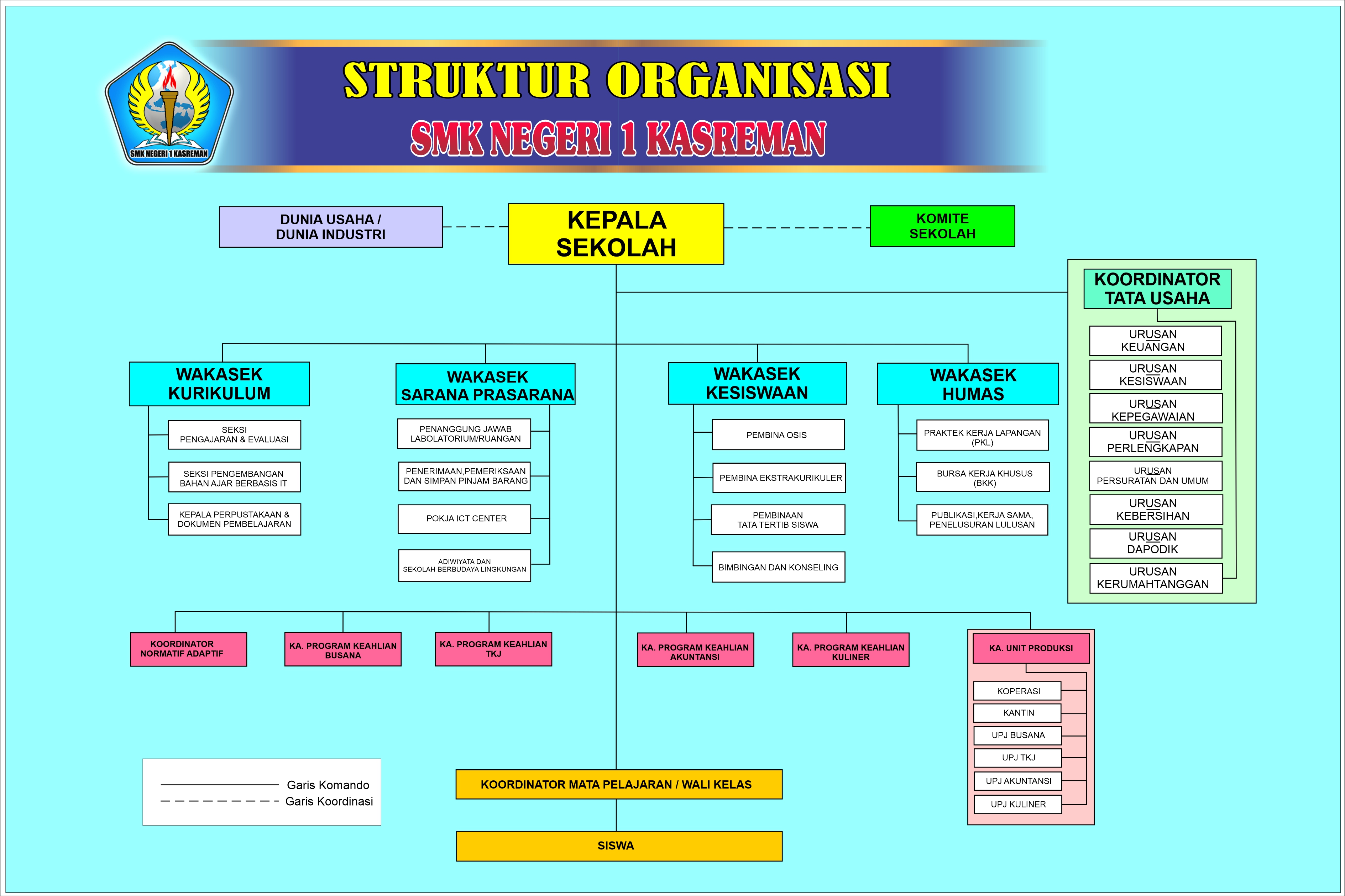 Struktur Organisasi SMKN 1 Kasreman merupakan gambaran susunan kepemimpinan dan pembagian peran di lingkungan sekolah yang menjadi dasar terciptanya tata kelola pendidikan yang efektif, profesional, dan berintegritas.